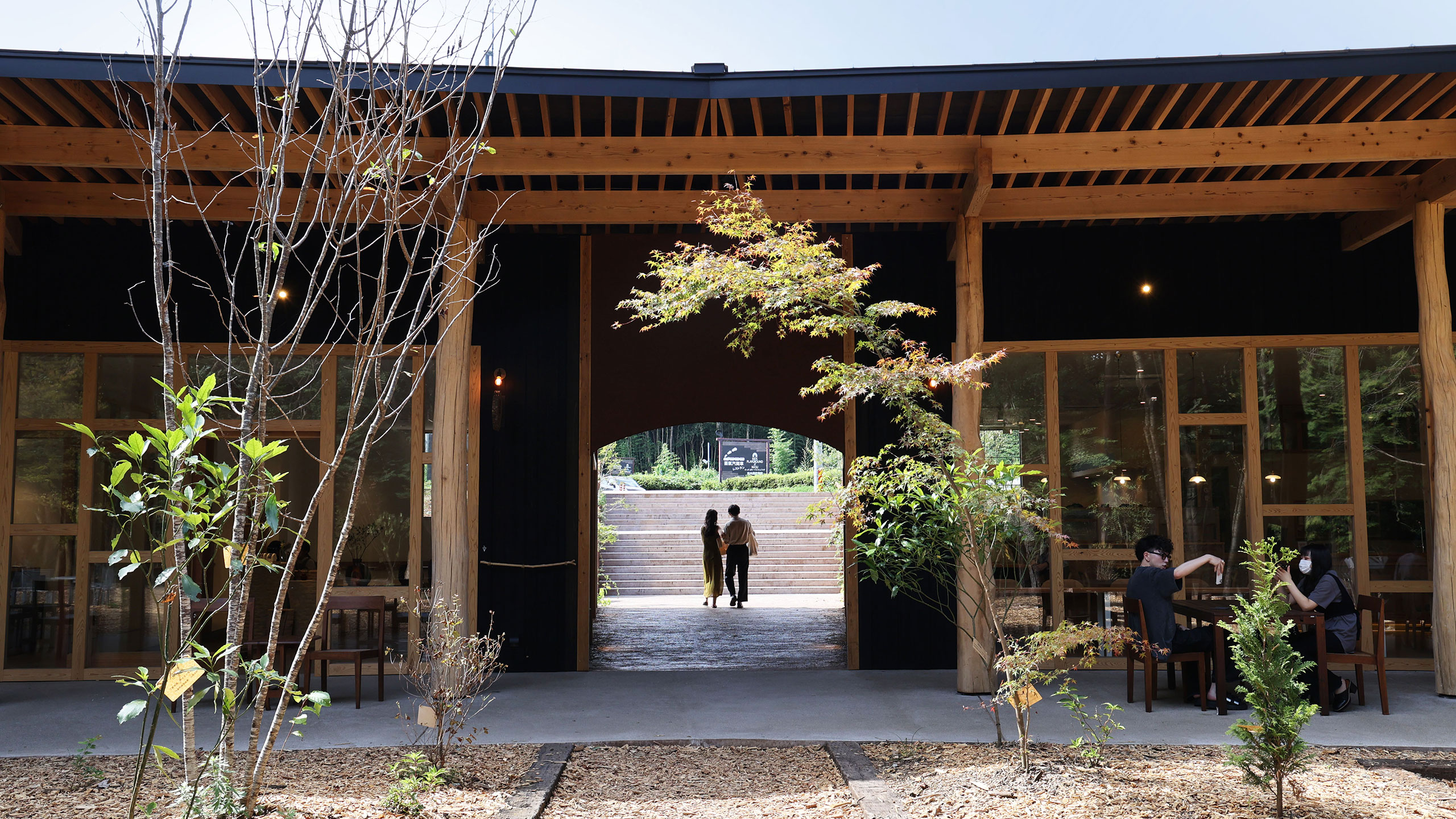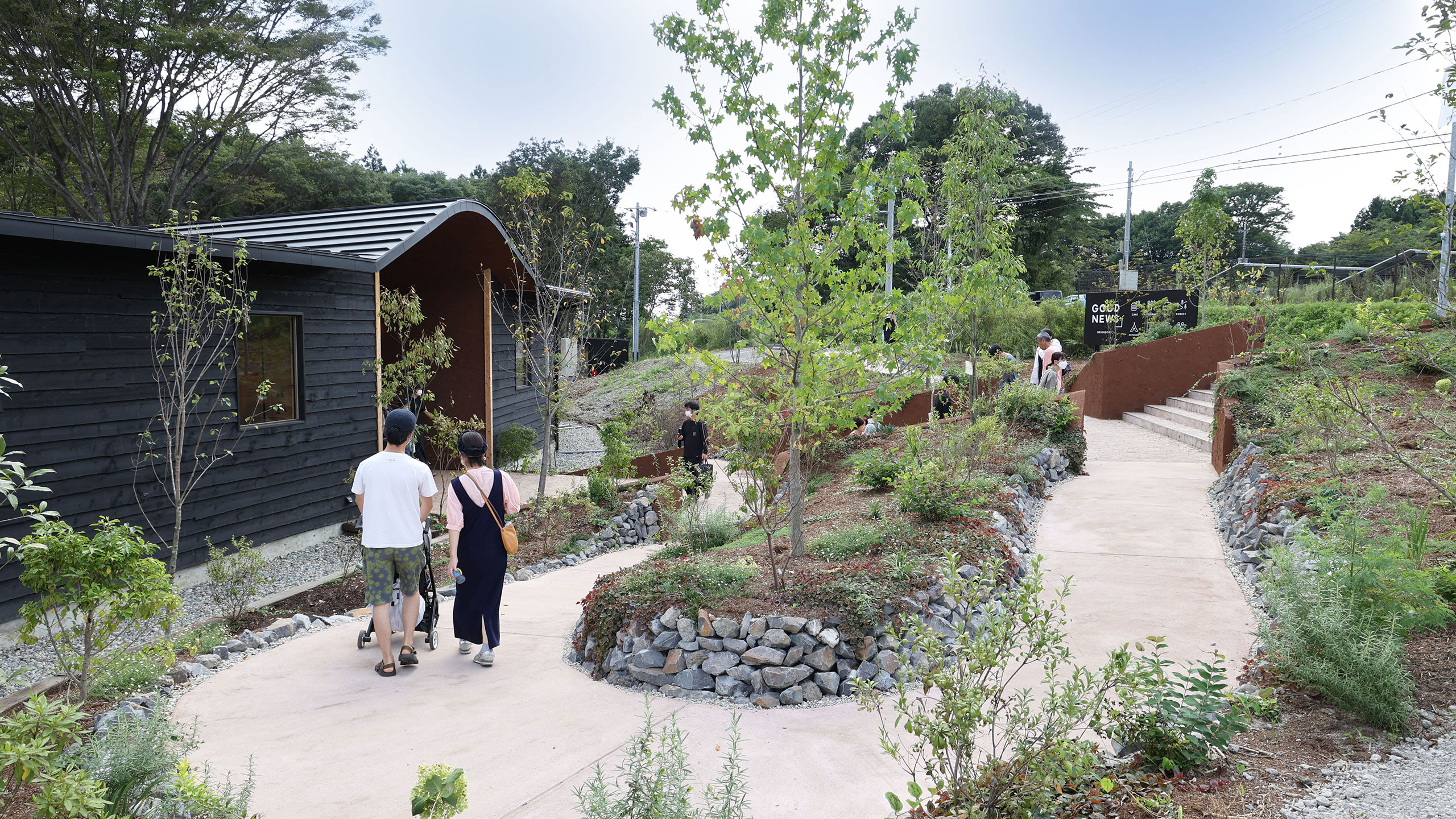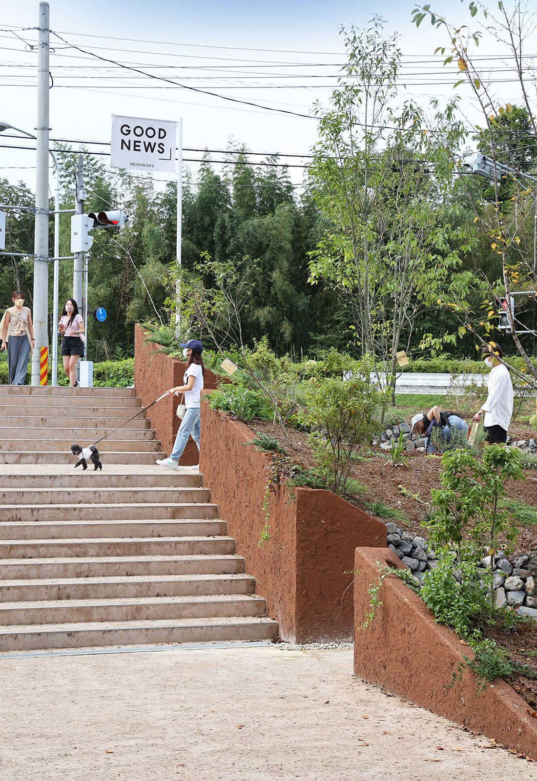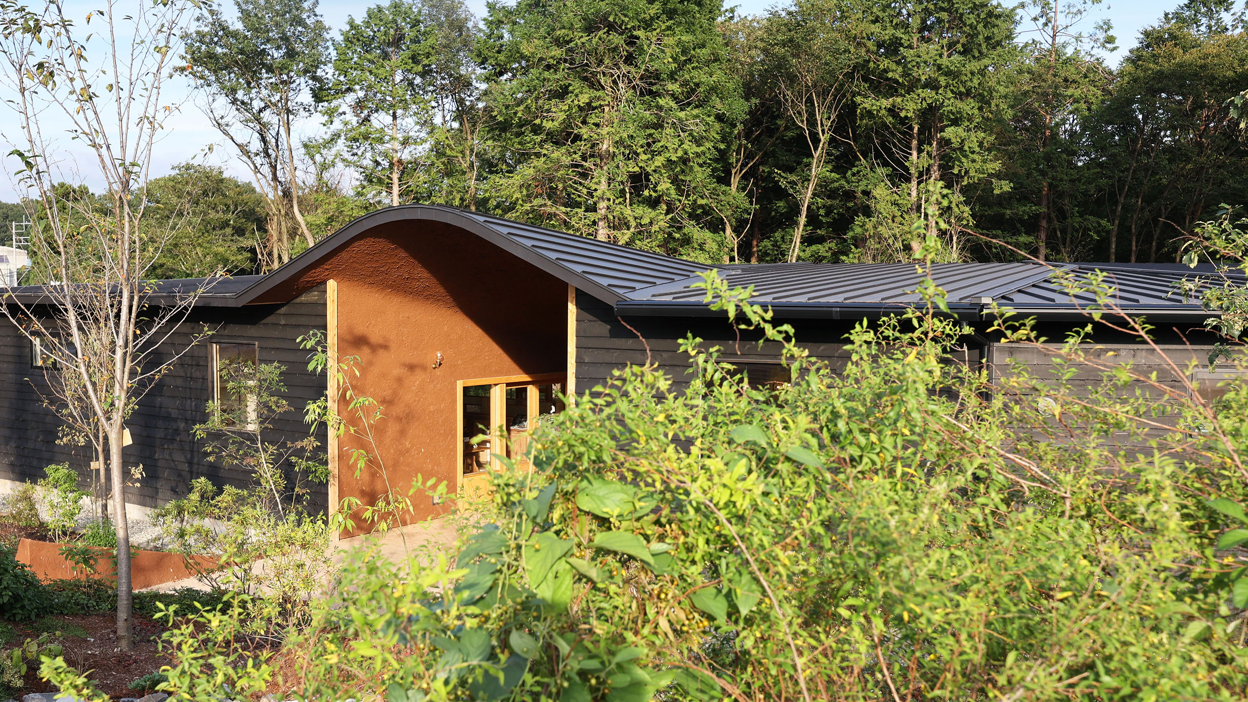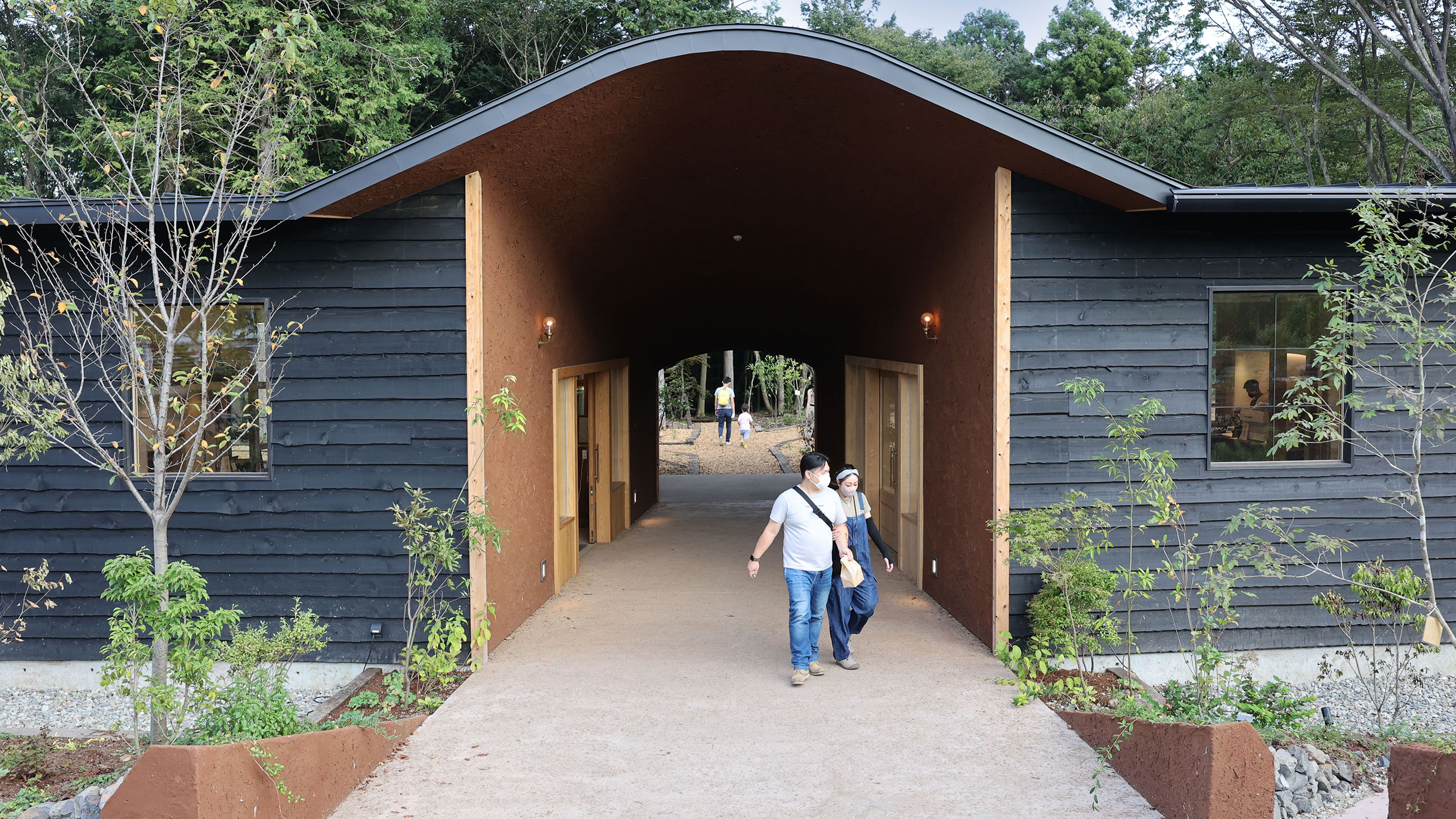 リボンのように緩やかにくねりながら降りていくスロープはバリアフリー対応となっていて、健常者も、お年寄りも子供たちも、ベビーカーも車椅子も誰でもこの施設にアプローチできるように考えました。現地発生土を練りこんだ土壁や、竹チップを舗装の骨材に使用するなど、廃材利用を通じて環境への配慮をしています。